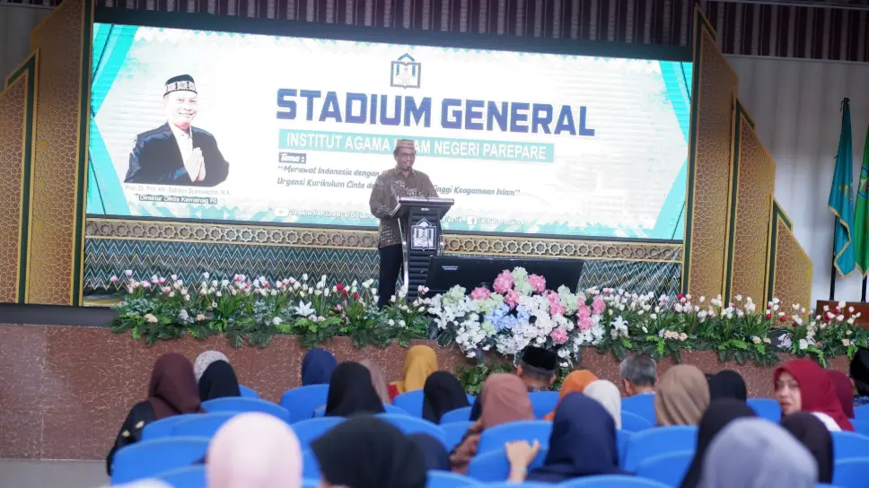 Humas IAIN Parepare- Institut Agama Islam Negeri (IAIN) Parepare menggelar Stadium General dengan tema “Merawat Indonesia dengan Cinta: Urgensi Kurikulum Cinta dalam Pendidikan Tinggi Keagamaan Islam” di Auditorium IAIN Parepare, Jumat (03/10/2025). Kuliah umum ini dibawakan langsung oleh Direktur Diktis Kementerian Agama RI, Prof.  Sahiron Syamsuddin.