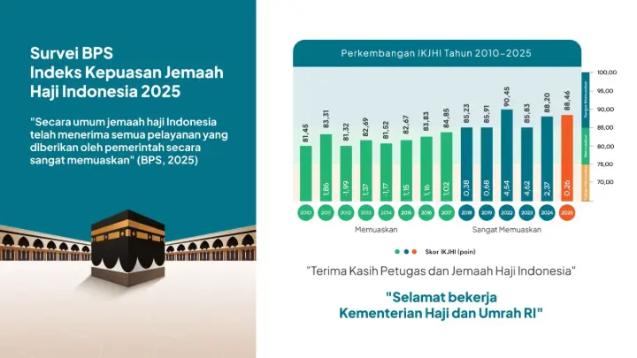 Sebelumnya, Badan Pusat Statistik (BPS) menyampaikan bahwa hasil perhitungan Indeks Kepuasan Jemaah Haji (IKJH) 2025, mencapai angka 88,46 dengan predikat sangat memuaskan.