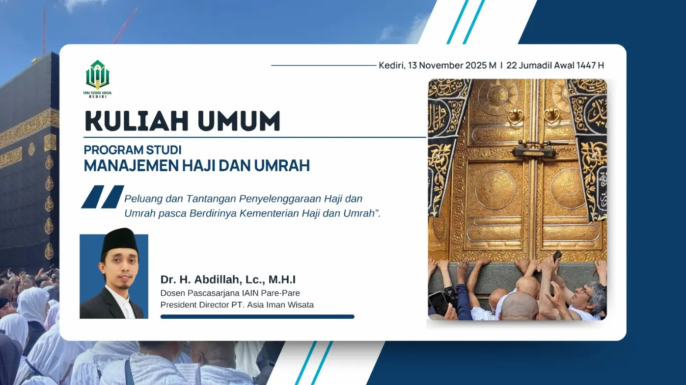 Kuliah Umum yang diselenggarakan oleh Program Studi Manajemen Haji dan Umroh (MHU) ini mengangkat tema strategis, yakni "Peluang dan Tantangan Penyelenggaraan Haji dan Umrah Pasca Berdirinya Kementerian Haji dan Umroh". Kuliah umum ini juga turut dihadiri oleh pimpinan fakultas dan prodi MHU, termasuk Wakil Dekan Fakultas Ushuluddin dan Dakwah.