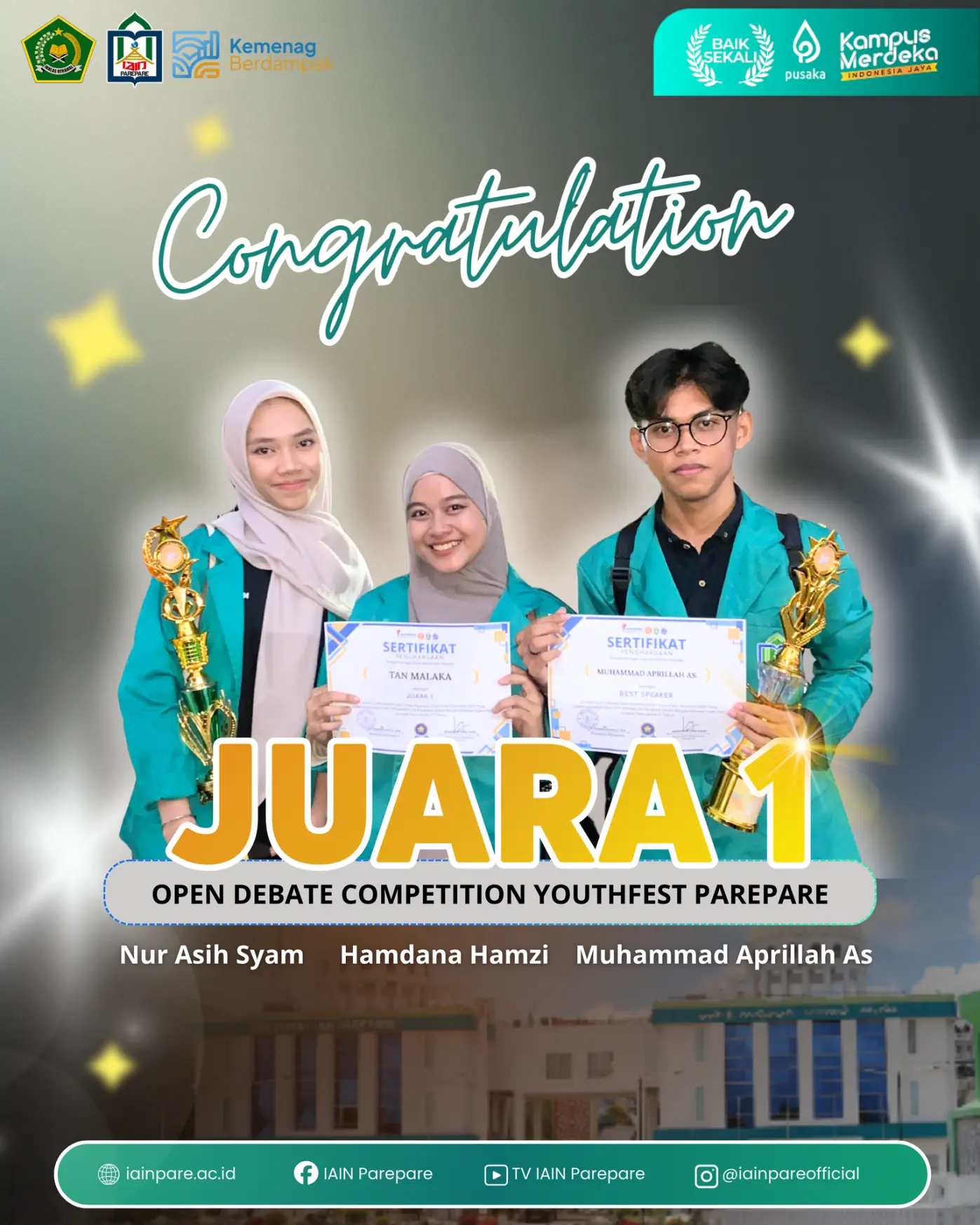 “Kami sangat mengapresiasi perjuangan dan dedikasi mahasiswa yang telah membawa nama baik IAIN Parepare. Prestasi ini menunjukkan bahwa mahasiswa kita memiliki potensi luar biasa dalam berpikir kritis, berargumentasi, dan berkompetisi secara sehat,” ujarnya.