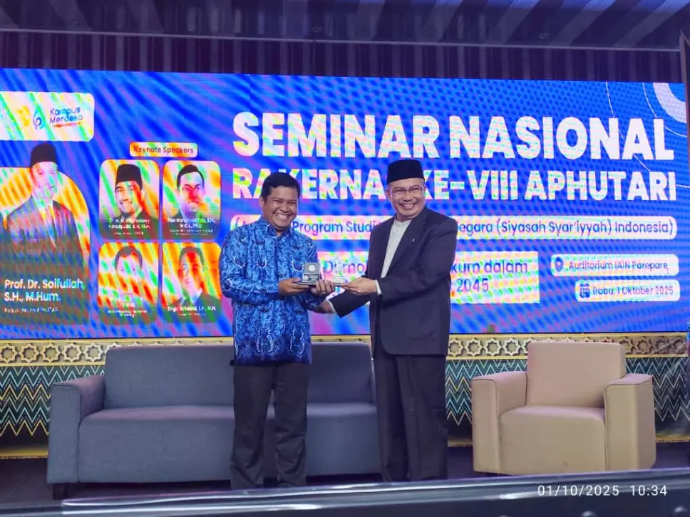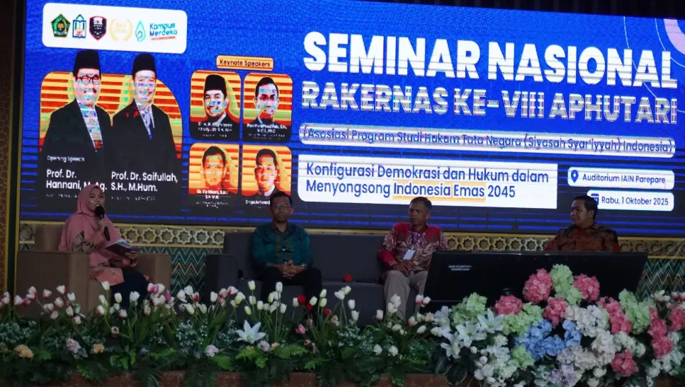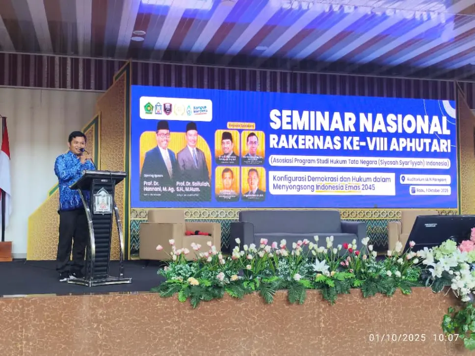 Humas IAIN Parepare - Asosiasi Program Studi Hukum Tata Negara (Siyasah Syari’yyah) Indonesia (APHUTAR)I menggelar Seminar Nasional dan Rapat Kerja Nasional (Rakernas) ke-VIII di Auditorium IAIN Parepare pada, Rabu (01/10/2025). Mengangkat tema krusial “Konfigurasi Demokrasi dan Hukum dalam Menyongsong Indonesia Emas 2045,” kegiatan ini mempertemukan para akademisi dari Program Studi Hukum Tata Negara (HTN) dari seluruh Perguruan Tinggi Keagamaan Islam Negeri (PTKIN) dan Perguruan Tinggi Keagamaan Islam Swasta (PTKIS) se-Indonesia.